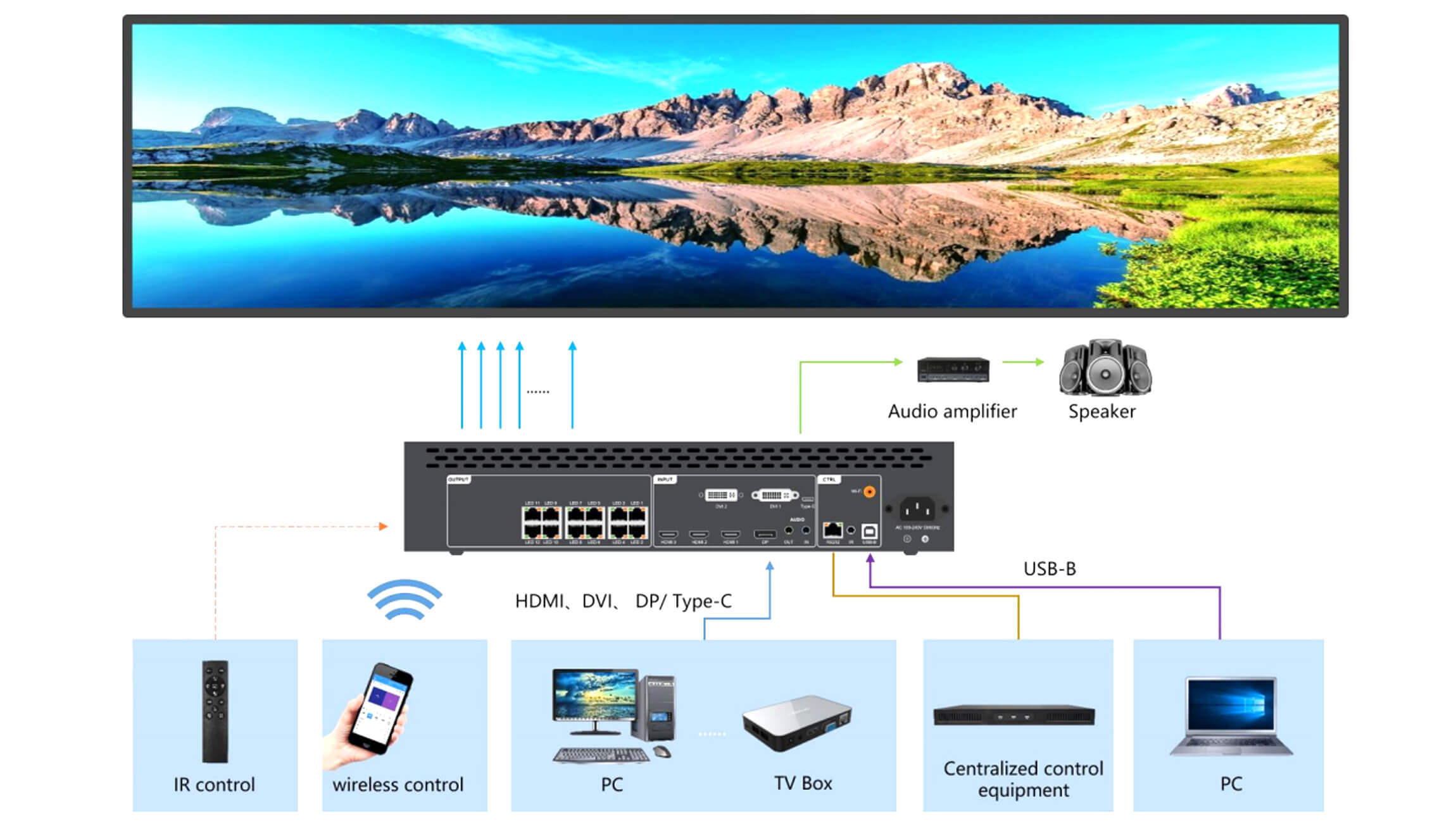 Support 1 channel of DP/1 channel of Type-C (both cannot be used at the same time), 1 channel of HDMI 2.0, 2 channels of HDMI 1.4, 2 channels of DVI signal input, multiple video signals can be switched arbitrarily.