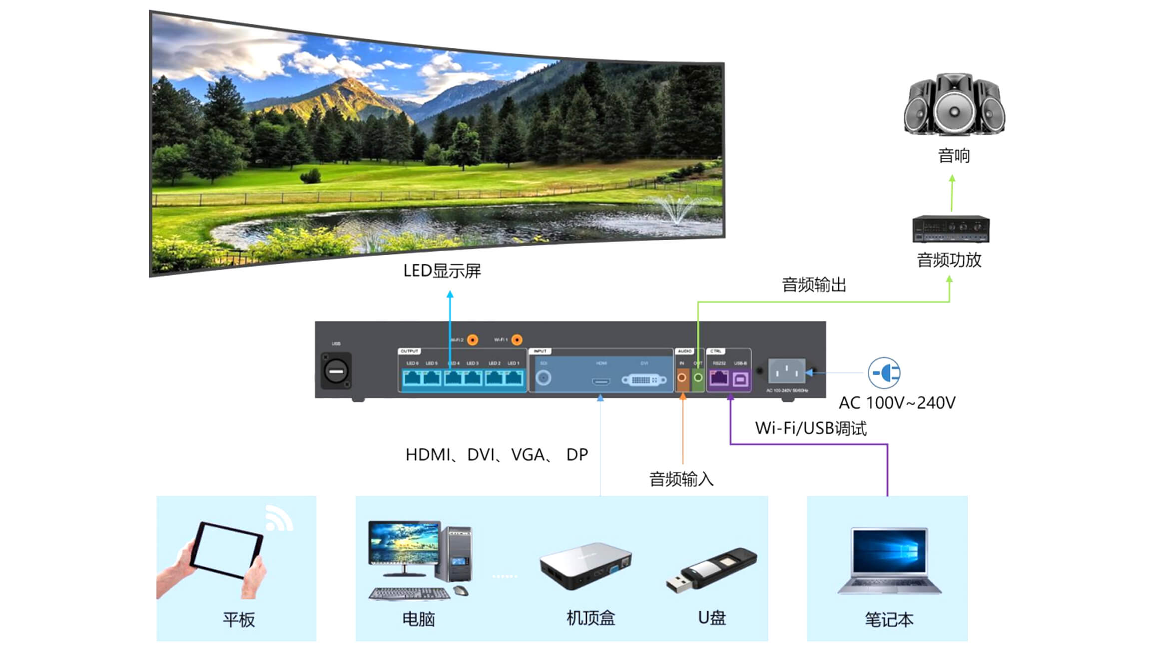 HD-VP630-TP is a new architecture LED display 2-in-1 video processor, integrated with 6 Gigabit Ethernet port outputs, supports three-screen arbitrary display; standard Wi-Fi function, supports mobile phone APP wireless control and computer wireless debugging, supports mobile phone/tablet wireless screen projection; has 1 HDMI, 1 SDI and 1 DVI signal input, multiple synchronous signals support seamless switching, can be used in hotels, shopping malls, conference rooms, exhibitions, studios and other occasions that require synchronous playback.