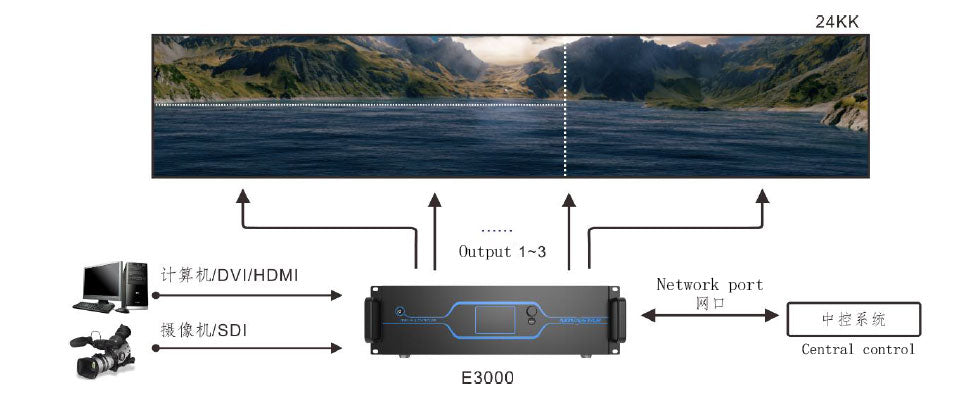E3000 is equipped with 3 output cards and 12 output interfaces. Each card output load capacity can reach 4K×2K@60Hz. The single machine supports up to 24 Single Link hybrid layers. When a single E3000 is fully loaded, the output capacity can reach 24KK.
